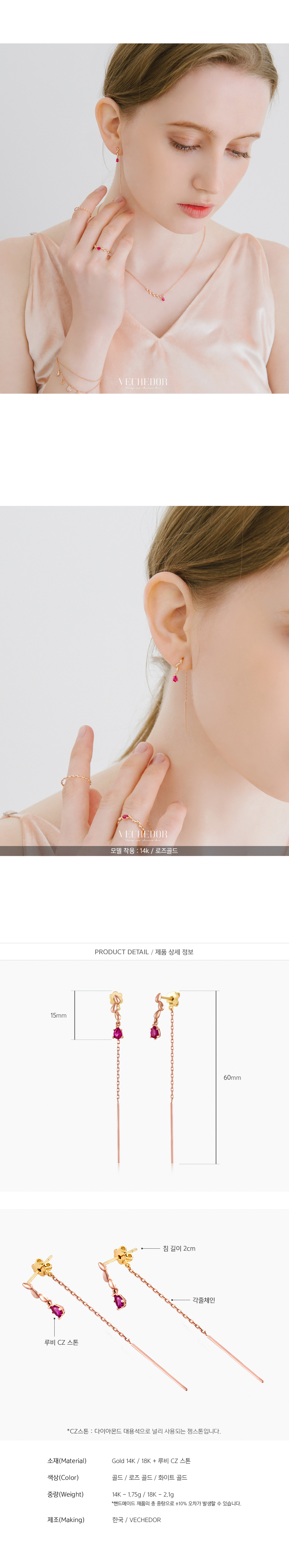 베체도르 14k 18k 그레인 로사 드롭 귀걸이는